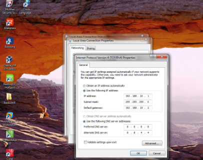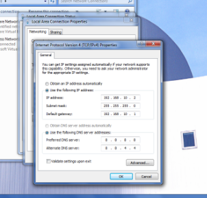 - Pilih Use the following IP Addres dan masukkan IP Address yang anda inginkan sesuai ketentuan jaringan anda seperti, Gatewaynya atau DNSnya. Setelah itu tekan OK. (Pada PC 1 saya akan menambahkan IP Adress : 192.168.10.1 , Subnet Mask : 255.255.255.0 , Default Gateway : 192.168.10.2).