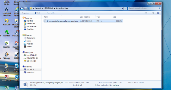 - Untuk mengecek apakah folder yang dikirim oleh komputer satu berhasil atau tidak maka jalankan Run pada komputer dua, ketikan IP Address komputer satu 192.168.10.1 klik OK