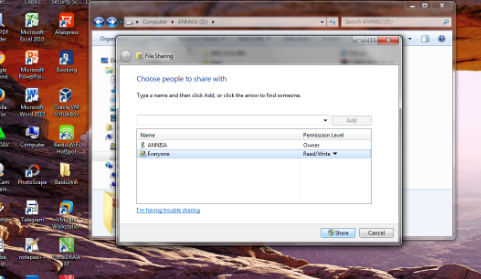 - Akan muncul tampilan seperti dibawah ini kemudian pilih everyone, kemudian diarea tanda seperti segitiga pilih read/write dan klik share
